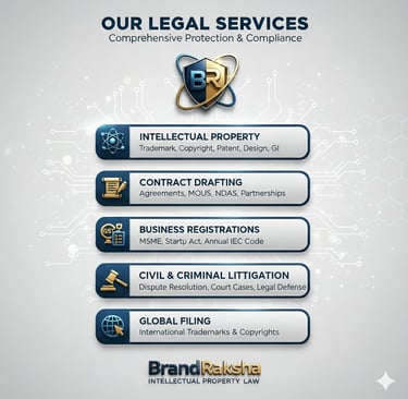 Welcome to BrandRaksha, your trusted partner for specialized Intellectual Property Rights (IPR) and complete legal compliance. We believe that securing your innovations and protecting your peace of mind are the foundations of success. Our firm provides a future-forward legal strategy, designed to safeguard your interests both domestically and internationally.